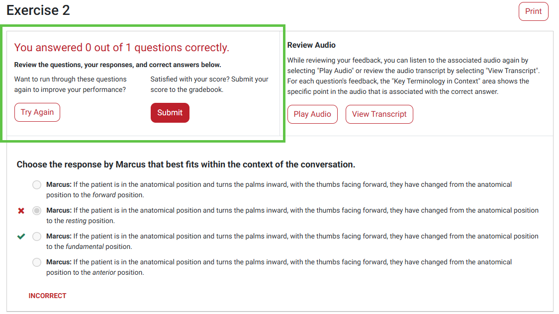 Once on their feedback screen for an exercise with the "Practice and then Grade" Grading Rule, students can click a "Try Again" to discard the score from their current attempt and begin the exercise anew.
