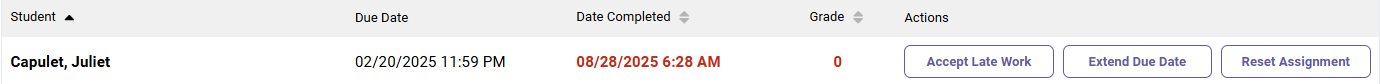 If you've reset an assignment after its due date, the student's previous grade may be replaced with a red zero indicating the assignment is late. You can use the “Extend Due Date” button to give the student a new due date for their next attempt, or use the "Accept Late Work" button to accept their work after they submit again.