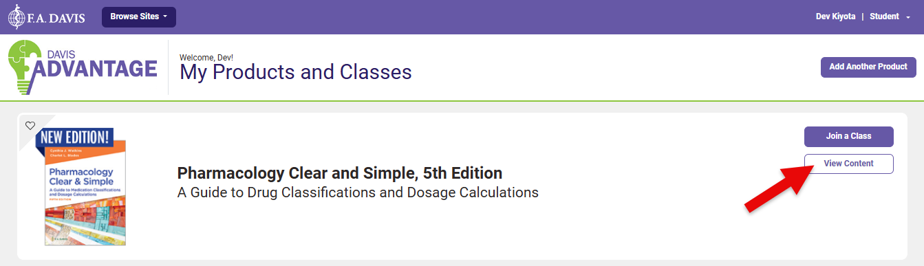 Instead of launching your inserted Advantage assignment links, students completing work via Independent Study mode log into FADavis.com or the Davis Advantage website directly. After doing so, they click the "View Content" button of a textbook for which they've never enrolled in an Advantage class.