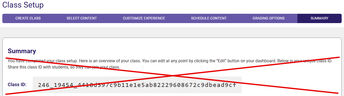 Though the Summary step of your Advantage Class Setup directs you to do so, you will not have to provide students with a Class ID to enroll them in your integrated Advantage class. Furthermore, if a student asks you for a Class ID, that's an indicator they are trying to access your Advantage class incorrectly.